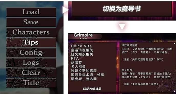 此时,可以打开游戏菜单(PC 端为鼠标右键),点击左上角的“TIPS”按钮,进入“情报录”界面。